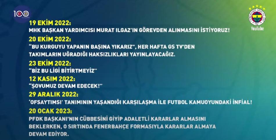 Bunlardan ilki. Örnek manzumesinden seçilmiş olan 5-6 tane mesaj. 19 Ekim 2022 MHK Başkanı Murat Ilgaz'ın görevden alınmasını istiyoruz, Fenerbahçe Kongre üyesi dediler. İlke yakın bir hadise. Bir kurumun başkan yardımcısı hedef alındı. En ufak bir alakası olmadığı ortaya çıktı. Tıpkı aynen geçen yıl, hakemin Fenerbahçeli şirketlerde çalıştığı algısı gibi. Bu ligi bitirtmeyiz dediler. 12 Kasım'da şovumuz devam edecek bir cümle izledik. Ne değişti? 29 Aralık'ta ofsaytımsı kavramı ile muazzam bir infial yaşandı. 20 Ocak'ta PFDK Başkanın'nın Fenerbahçe formasıyla karar alıyor dediler. Yine bu da gerçekle uzaktan yakından alakası olmayan bir durum olarak ortaya çıktı.